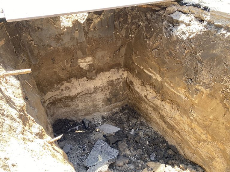 We use a single component material that will penetrate into the soil and lock all of the particles of soil together so that the excavator can dig right next to it and the soil will maintain its form and not collapse. It’s almost as if it changes into concrete. This process allowed the excavator to dig a hole just big enough to fit the tank in without compromising safety or soil integrity.